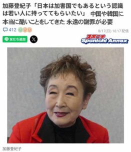 加藤はその上で、 高市総裁が選出された先月、たまたま沖縄県にいたというエピソードに言及。「高市さんの言葉からすると、そんなことは思いたくないけど、防衛費をものすごく増強させて…。沖縄の人が離島に基地が作られているということにものすごく危機感を持っている。日本が防衛を増強するということは、逆に日本がやる気だということは、日本を攻撃目標にしてもいいよというようなことを言っているような結果になるので、非常に危機をあおるという状況がすでにあります。本気でやるという姿勢を高市さんが示しちゃったということなんですよ」と持論を展開。その上で、「これだけの影響があると分かったら、早いうちに、米中関係がいい関係にしようとしているうちに、早く撤回してほしい。はっきりと切り替えてほしい」とコメントしていた。
