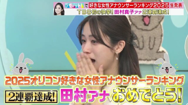 「好きな女性アナウンサーランキング2025」(ORICON NEWS)が5日に発表され、TBSの田村真子アナウンサー(29)が2年連続で1位に輝いた。