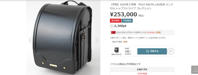 「デパートで見かけたランドセルは何と253000円!! 高いものは40万円もするものまであるらしい」と驚きをつづり、実際に店頭に並んでいたランドセルの写真を添えた。