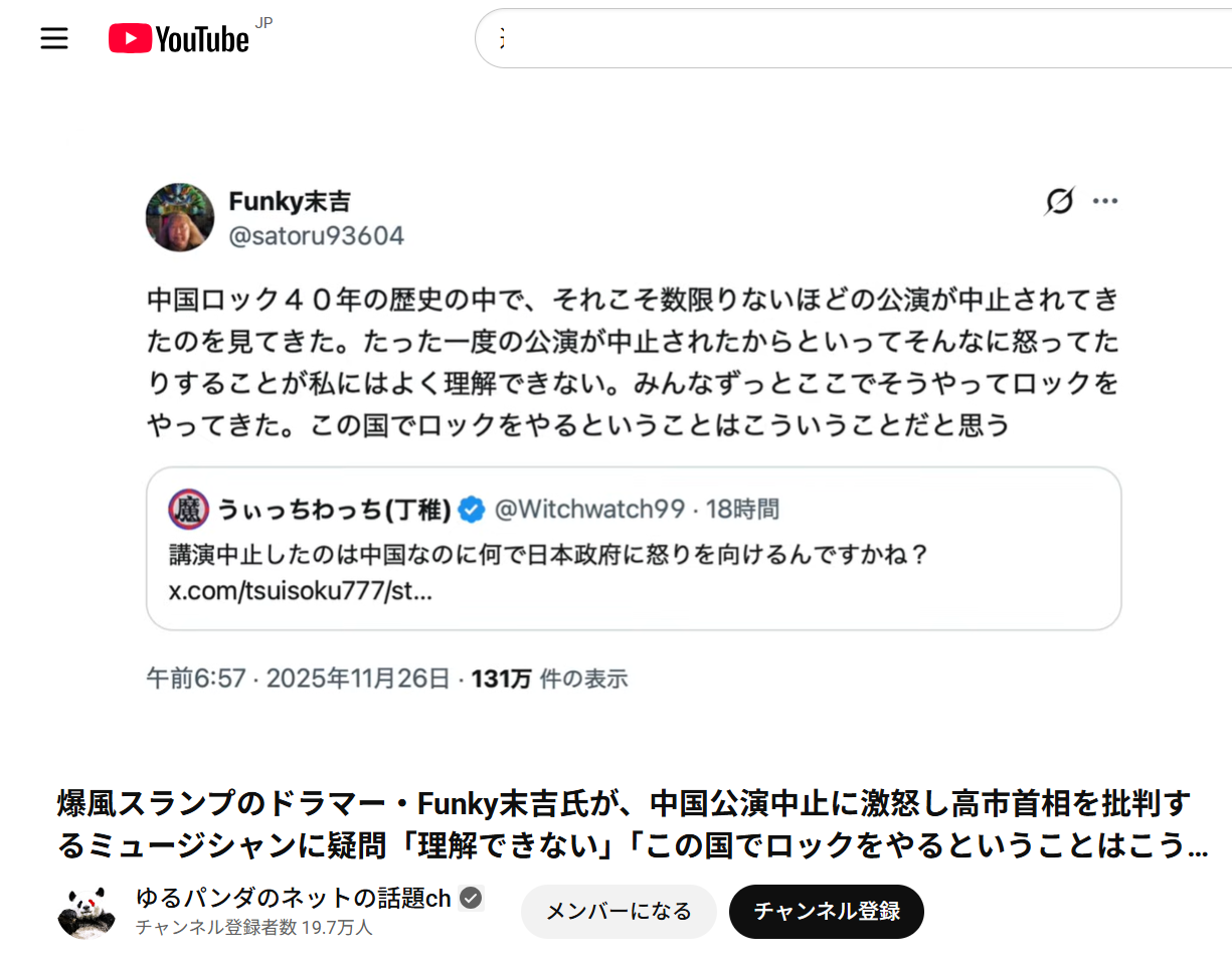 | 028 | 名無しさん | 2025/11/30(日) 15:08:50 | もう、中国に引っ越しして中国人になれよ | 画像なし |
