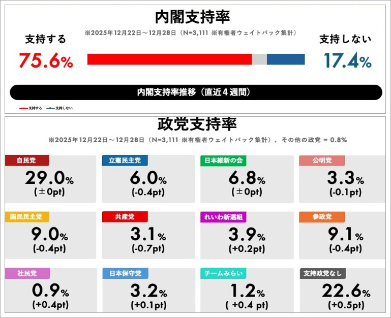 | 005 | 名無しさん | 2025/12/31(水) 21:05:21 | 内閣支持率75.6%、年末も75%台を堅 | 画像 |