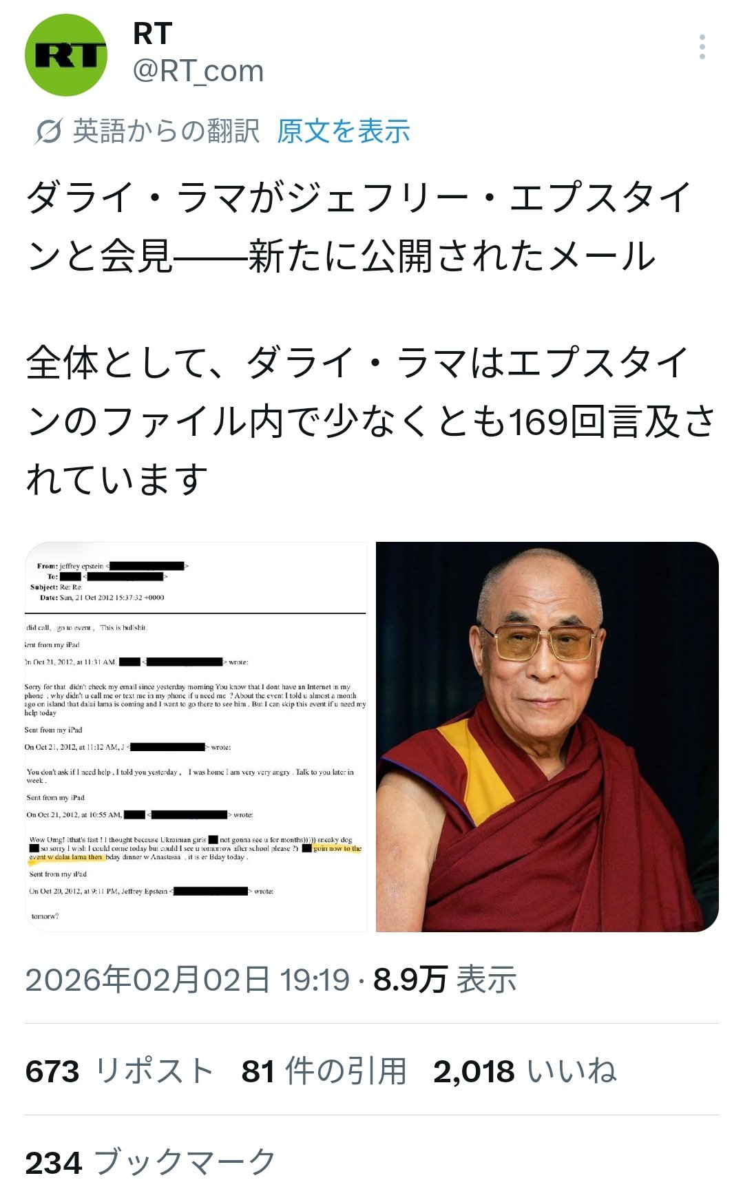 | 007 | 名無しさん | 2026/02/03(火) 14:39:02 | エプスタイン ダライ・ラマ で検索 | 画像なし |