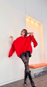 ピンクのシャツに超ミニ丈のトップス、ミニボトムを合わせ、抜群のスタイル、