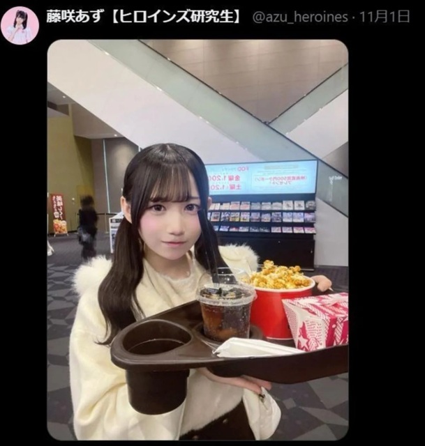 「藤咲さん本人が11月1日、自身のXに映画館らしき場所でポップコーンとコーラの載ったトレーを持っている画像をアップしました。