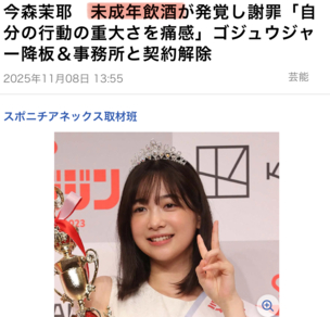 所属サイトはもサイトを更新し、「この度、弊社所属タレントの今森茉耶につきまして、20歳未満でありながら飲酒行為を行っていた事実が確認されました。