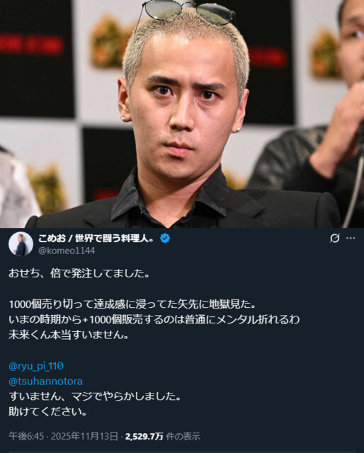 14日、料理研究家の「リュウジ」(同542万人)がこの投稿に反応し、