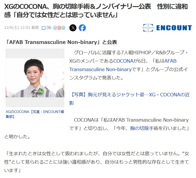 COCONAは「私はAFAB Transmasculine Non-binaryです」と切り出し、「今年、胸の切除手術を行いました」と明かした。