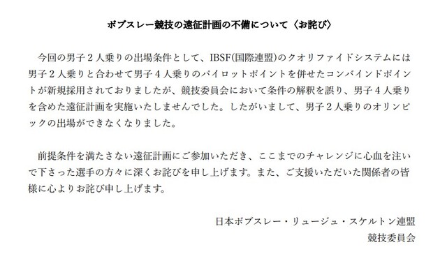 同連盟は「ボブスレー競技の遠征計画の不備について〈お詫び〉」と題したプレスリリースを公表。日本が出場