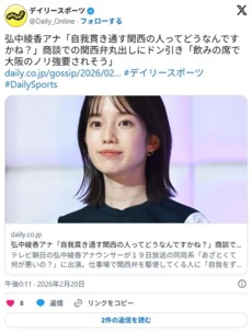 テレビ朝日の弘中綾香アナウンサー(35)が語った“関西弁を貫く上京者”への違和感が、SNSで物議を醸している。